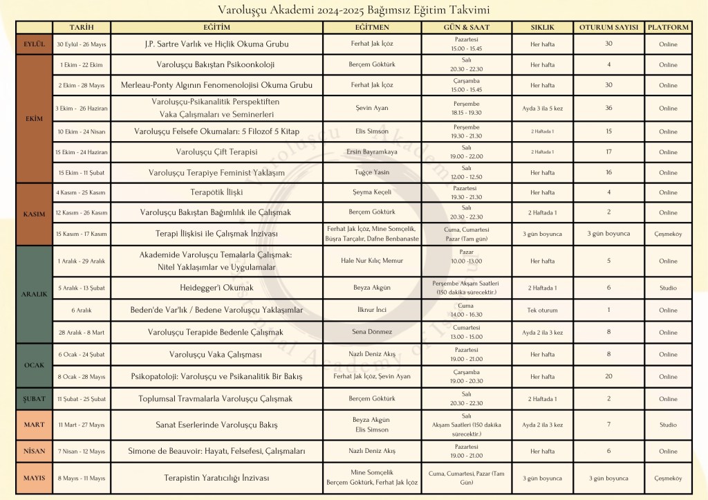 Bağımsız Eğitimler 2024-2025 eğitim dönemi boyunca Varoluşçu Akademi çatısı altında gerçekleşecek eğitimleri sizlere duyurmak isteriz. Her ay başında yaklaşan eğitimlere dair detaylı içerikleri duyuruyor olacağız. Bunu paylaş: X'te paylaşmak için tıklayın (Yeni pencerede açılır) X Facebook'ta paylaşmak için tıklayın (Yeni pencerede açılır) Facebook Beğen Yükleniyor...